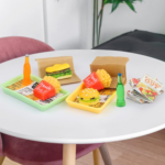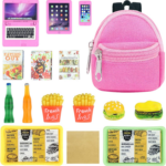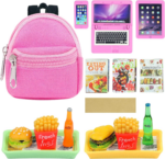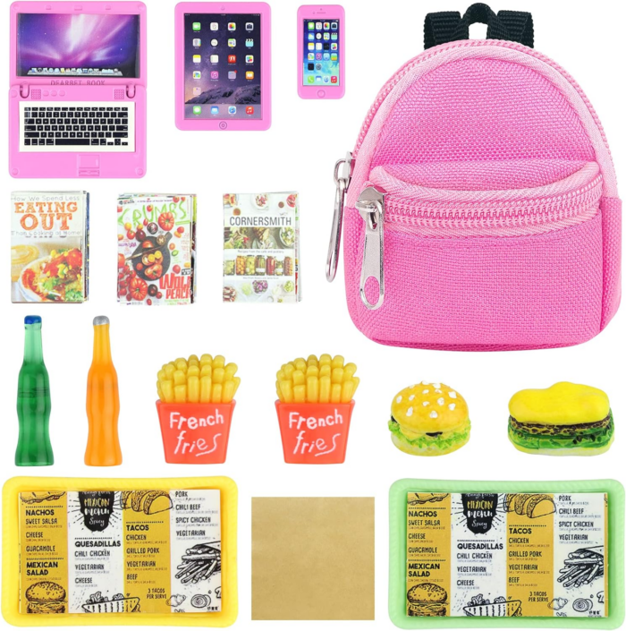 - What you get – 1 mini laptop, tablet, cell phone, 1 pink backpack bag, 2 mini fast food game console American hamburgers, 2 fries, 2 sturdy trays, 2 sodas, 3 magazines