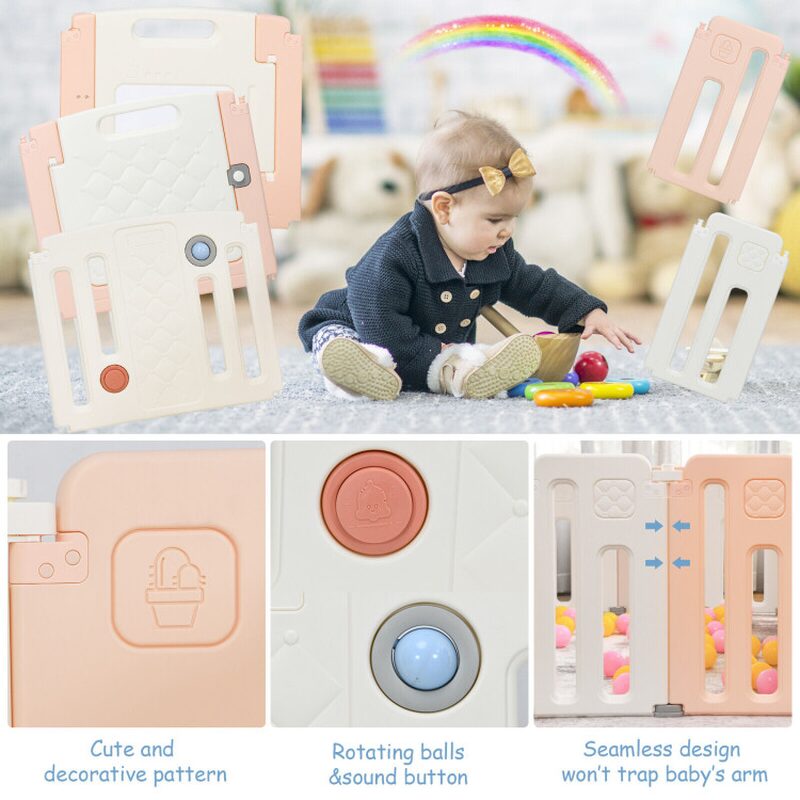 In addition to its robust safety features, this playpen includes a door panel equipped with a safety latch to keep your child secure inside. Behind the door, a dry-erase whiteboard encourages creativity, allowing your child to express their imagination with markers. The gaming panel is designed with rotating balls and a sound button, offering interactive fun for toddlers. Constructed from non-toxic, BPA-free materials and ASTM certified, this playpen is suitable for children aged 6 to 36 months, providing parents with peace of mind while they attend to household tasks. With its folding design, the playpen can be easily stored away when not in use, making it a practical addition to any home.