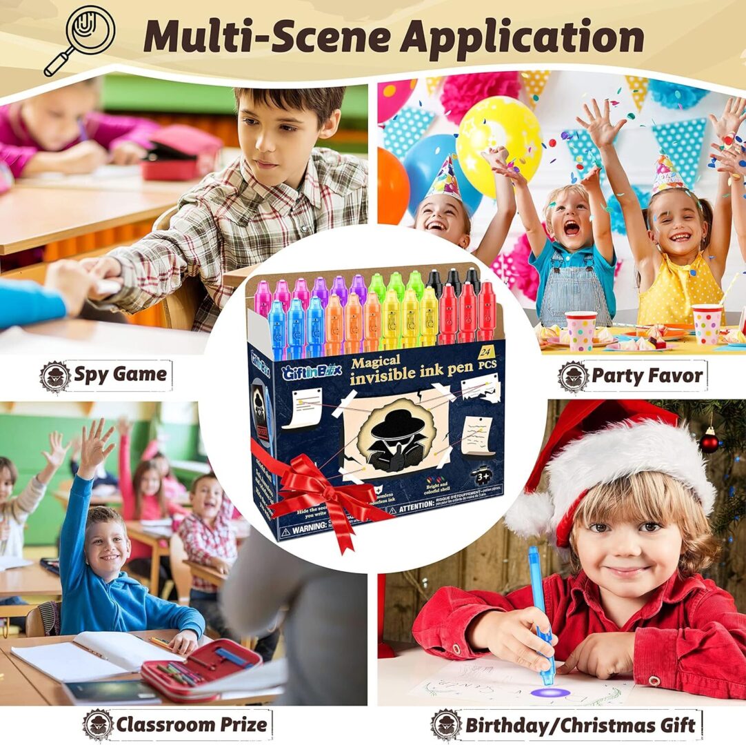 Enhance your child's creativity and playtime with the GIFTINBOX Invisible Ink Pen Set. This remarkable collection includes 24 pens and 24 mini notebooks, perfect for hosting a thrilling spy-themed party. Kids can enjoy writing secret messages that become visible only under UV light, adding an element of mystery and excitement to their imaginative play.