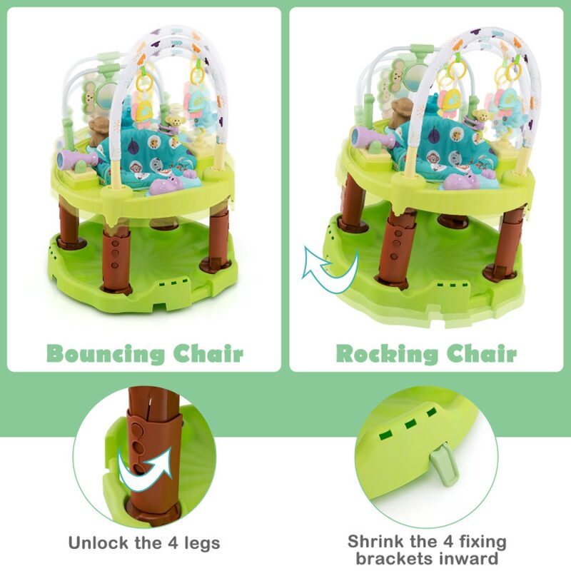 • 3-level adjustable height for the bouncing saucer and activity table, accommodating your child’s growth.