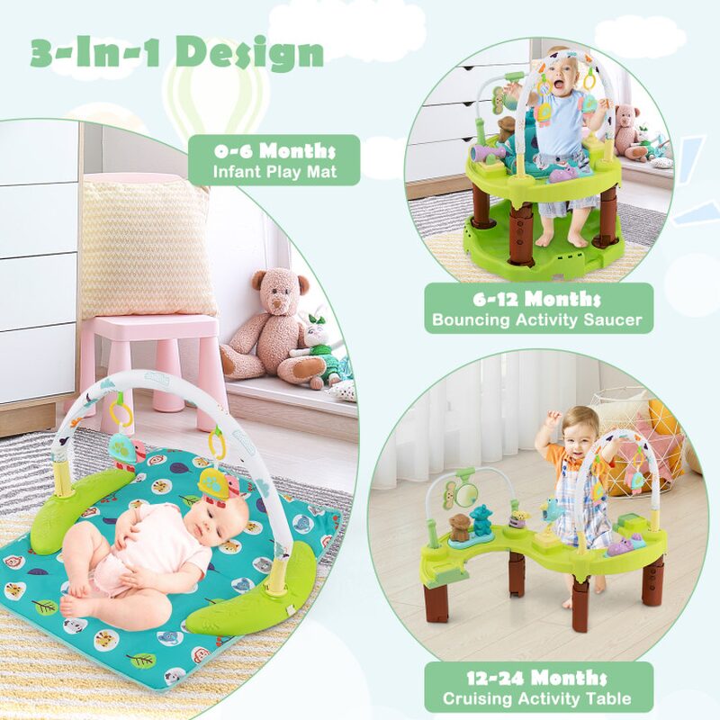 • Triple functionality: play mat, bouncing chair, and activity table for versatile use.