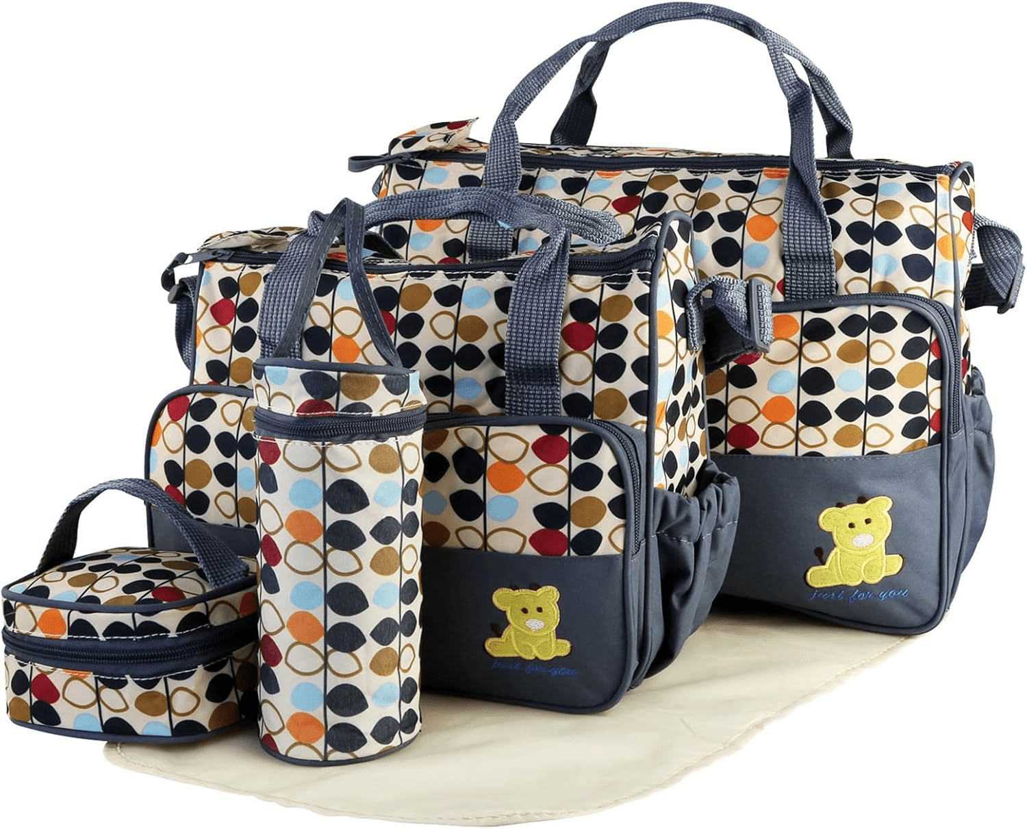 - Five-piece set includes large bag, medium bag, insulated bottle bag, food bag, and diaper mat.