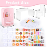 - SIZE– Refrigerator size approx: 7.5 x 6 x 12 cm/ 2.95 x 2.36 x 4.72 inches,Table size 11.5 x 6 x 6cm/4.5 * 2.36 * 2.36 inches, chair size 9 x 4 x 4cm/3.5 x 1.6 x 1.6 inches, the ice cubes approximately 4mm , and the food toys and mini drink bottles measure approx. 0.9 to 2.9 cm/ 0.35 to 1.14 inches