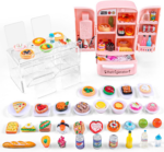 - PACKAGE INCLUDES — 1 Dollhouse Refrigerator + 40 pieces miniature food + 20 Micro Bottles+1 pack of ice cubes + 1 dining table + 4 chairs + 12 mini Plates + 1 Ice Clip + 15 tableware. Including fruit, milk, milk tea, coffee, jam, tomato sauce, pizza, cake, doughnut, hamburger, French fries, toast, bread, sushi, sandwich, etc.Rich variety and quantity can allow children to enjoy playing time.