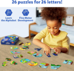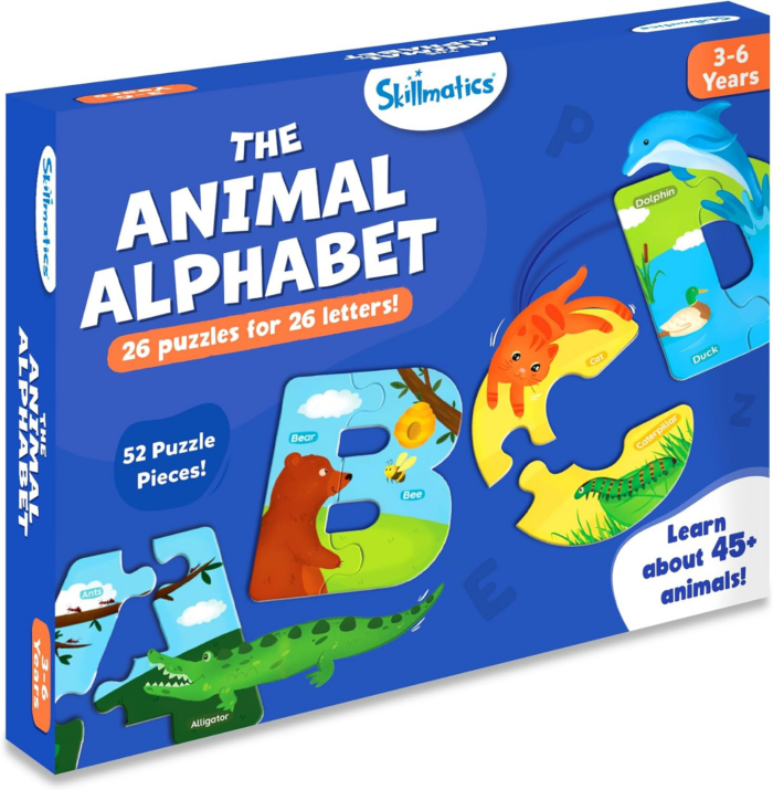 The Skillmatics Animal Alphabet Puzzle is a fun and educational jigsaw puzzle designed for toddlers and preschoolers. This puzzle set includes 26 mini puzzles, each consisting of two extra-thick cardboard pieces that are easy for children to put together. Once the puzzles are completed, they display colorful uppercase letters that feature over 45 different animals.