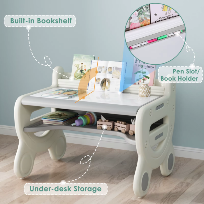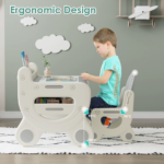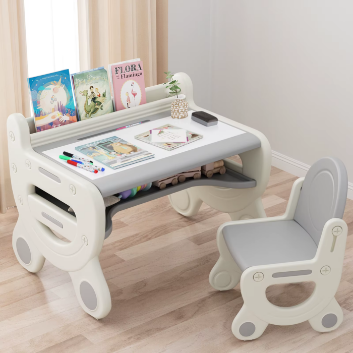 Featuring a unique magnetic and erasable tabletop, this set allows children to explore their artistic talents without the worry of permanent mess. The included watercolor pens and magnetic blackboard eraser make clean-up effortless, while the built-in storage solutions, including a spacious shelf and pen slot, help keep your child’s art supplies organized and easily accessible. With a stable double trapezoidal structure and non-slip pads, this table and chair set provides a sturdy and quiet workspace, accommodating both children and adults with impressive load capacities. The ergonomic design of the chair promotes good posture, ensuring that children can comfortably engage in their creative activities.
