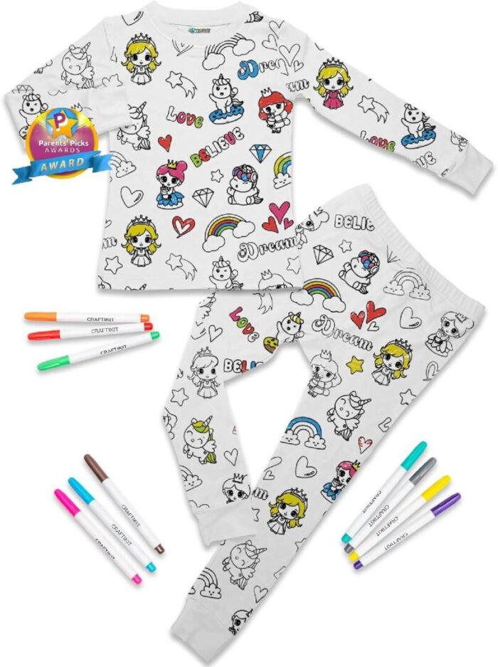 The Color Your Own Craftikit® Kids Coloring Pajamas offer a unique blend of creativity and comfort, allowing your little ones to express their artistic flair while enjoying a cozy night’s sleep. Made from a premium blend of 95% bamboo viscose and 5% Spandex, this soft two-piece unisex pajama set is designed to be gentle against the skin, ensuring a soothing experience during bedtime. The pajamas come equipped with permanent fabric markers, enabling children to personalize their sleepwear with vibrant designs that reflect their individuality.