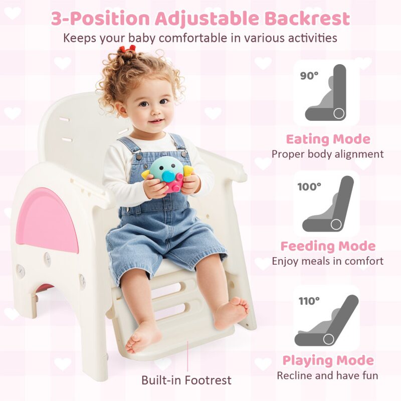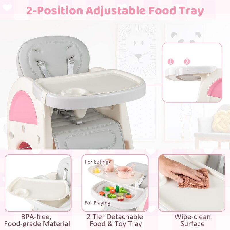 ● Adjustable Backrest & Tray: The high chair is equipped with a 3-level adjustable backrest and a 2-level adjustable tray, ensuring ergonomic comfort and ample space for your child to engage in various activities. The double-sided tray is removable, making it easy to clean and store when not in use.
