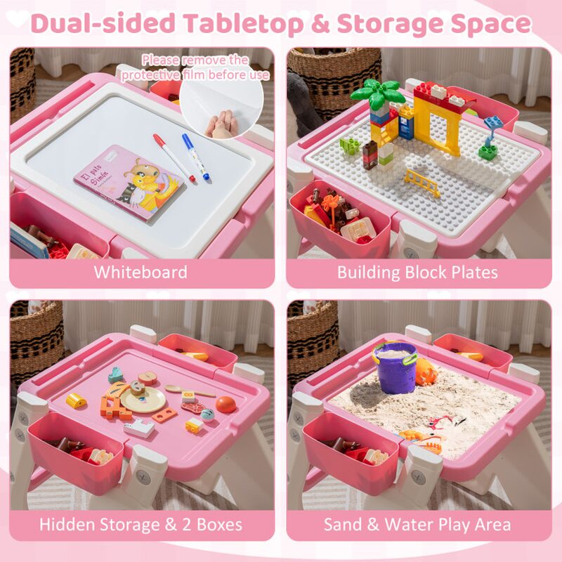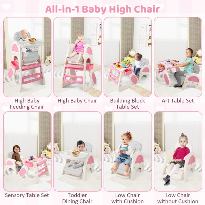 ● Double-sided Tabletop: The high chair features a detachable double-sided tabletop that enhances playtime and creativity. One side serves as a smooth whiteboard for drawing and writing, while the other is designed with a grooved surface ideal for building blocks. Additionally, the tabletop can be removed for sand or water play, providing endless opportunities for fun and learning.