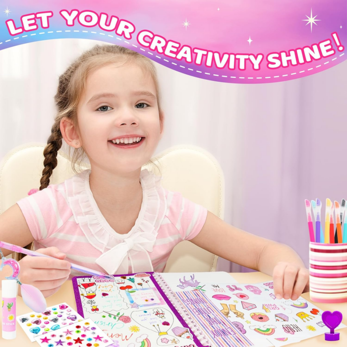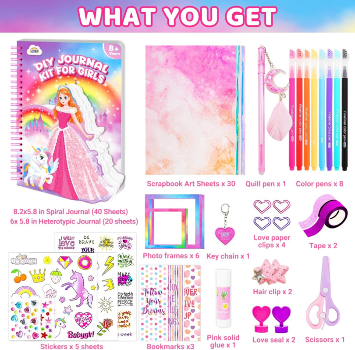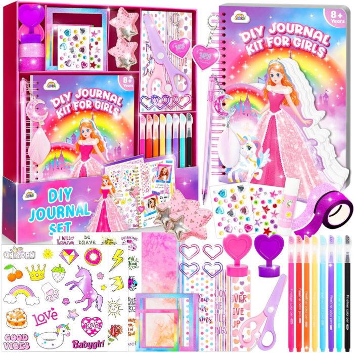 - The all-in-one DIY journal set is perfect for various applications, from documenting travel adventures and academic achievements to planning daily activities and holiday reflections. Each kit comes with an impressive array of supplies, including a spiral journal, stickers, scrapbook art sheets, photo frames, and a range of writing tools. This thoughtfully curated collection ensures that every girl can create a personalized journal that reflects her unique personality and experiences, making it an ideal gift for birthdays, Christmas, or any special occasion.