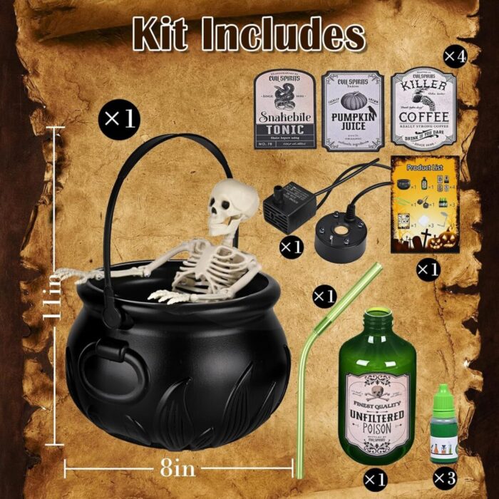 - 【Premium Floating Potion Cauldron & Easy Setup】This enchanting cauldron features a potion bottle that appears to float above it, creating a mesmerizing visual effect. Hidden stability tubes secure the bottle while mist spills over the edges, producing a captivating Halloween decor piece that enhances any setting. The complete Halloween kit includes a plastic witches cauldron (8"x11"), water pump, mist maker, decorative stickers, a skeleton prop, and an adjustable umbrella baffle. Setup takes just five minutes with our helpful video guide.