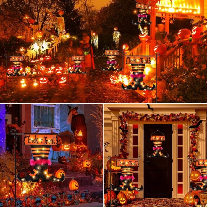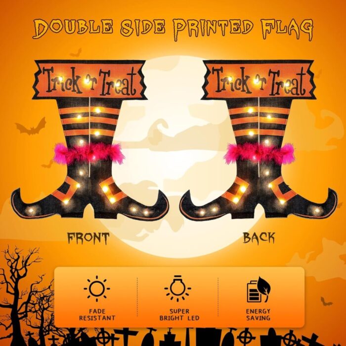 - 🎃【Perfect Halloween Decorations】The Qunlight Halloween Double-Sided Witch Feet Garden Flag is an ideal addition to your festive decor. Measuring 17.1 x 17.2 inches, this charming flag features 16 warm white LEDs that illuminate your yard, creating a lively and inviting atmosphere for Halloween celebrations. (Please note: flagpole is not included.)