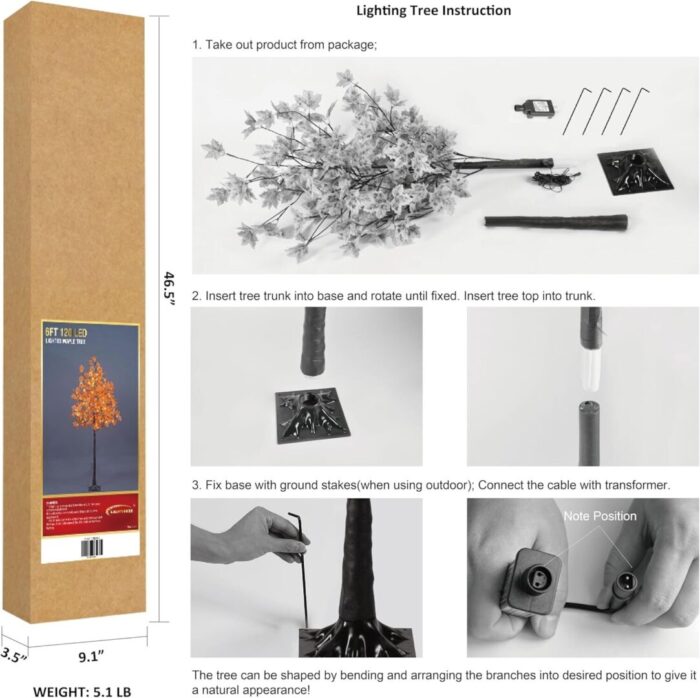 - The tree stands at an impressive 6 feet tall and is equipped with a reliable plug-in power supply, making it easy to set up and enjoy. Its unique Consolidus Base provides exceptional stability compared to traditional cross stands, ensuring that your maple tree remains upright and secure. Ideal for both indoor and outdoor settings, it comes with linen or gunny bags for added convenience, and can be easily disassembled for storage when not in use.
