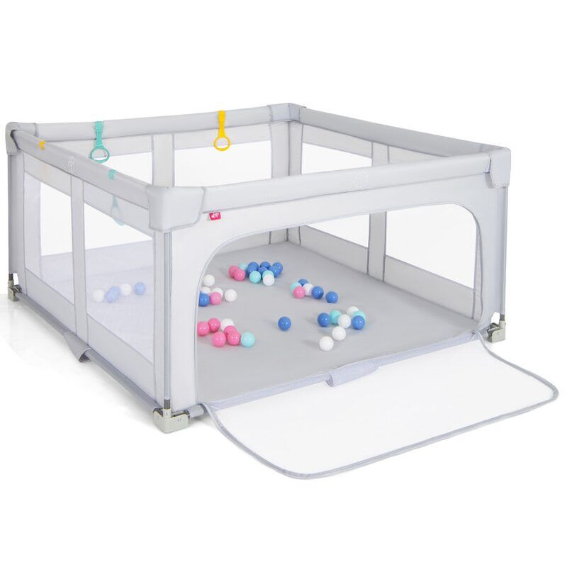Safety Enclosed: Crafted with your child’s safety in mind, this playpen features anti-collision foam pads at all top joints to cushion any potential impacts, minimizing the risk of injuries. The seamless design eliminates gaps that could lead to pinching, providing peace of mind for parents. Made from robust, child-safe materials, including a sturdy metal frame and BPA-free Oxford fabric, the playpen also includes a 360° see-through mesh cloth that allows parents to maintain visual contact with their little ones, promoting a sense of security. The convenient zip-open side door ensures easy access for both children and caregivers, while the included colorful ocean balls and pull-up rings enhance physical activity and motor skills development.