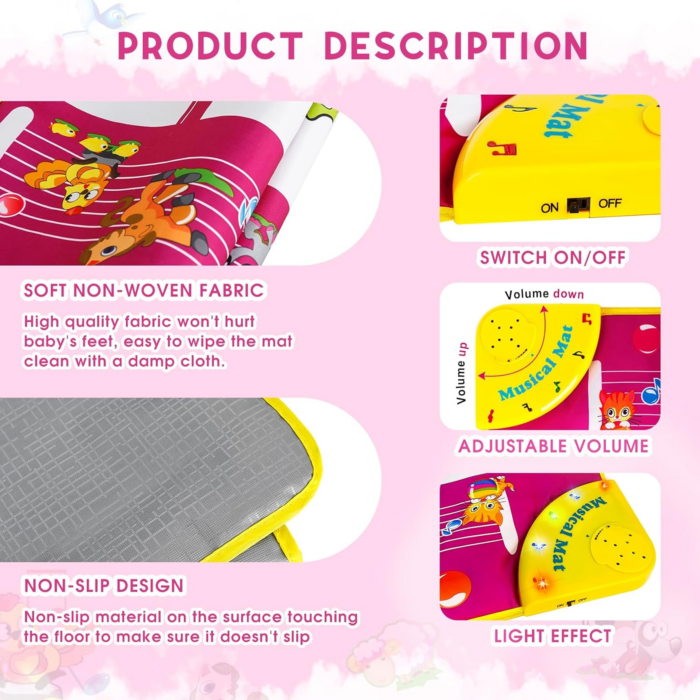 - Interactive playmat with 8 piano keys and 8 animal sounds