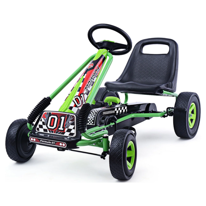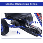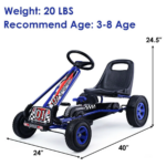 This is our new 4-Wheel Kids Ride On Pedal Bike, which is a perfect gift and toy for your children. Designed with racing style and flashy details, it will let your child cruise the neighborhood in style. It features heavy duty metal frame with adjustable high backed bucket seat, providing max safety and low-riding comfort. Plus, this Kids Ride On Pedal Bike also features clutch and brake, offering safety and reliability for your kids. It is recommended for kids aged 3-8 years old. Do not hesitate to add it to your cart. Rubber envelop tires provide good grip. Recommended for kids aged 3+. Heavy duty metal frame. High backed bucket seat. 3 position adjustable seat. Rubber tires provide good grip. Equipped With clutch and brake function. General function:go forward and backward. Assembly required. Color:Blue. Material of car body: Iron + PP plastic. Material of tires: Rubber(outside) + plastic(inner). Overall size:41.5” x 23.2 x 24.4”(L x W x H). Weight capacity:66Lbs. Suitable age:3+. Package includes: 1x Kids Ride On Pedal Bike 1x Instruction. DURABLE & SAFE MATERIAL– Constructed by metal frame and Polypropylene plastic which is non-toxic, odorless, light- weighted for your kids to enjoy their happiness. They can play it no matter indoors OR outdoors, on a sunny day OR rainy day, this pedaling go-cart gives your child control over their own speed and is a fantastic way to keep them active and moving!We have provided you with a detailed installation link:https://youtu.be/8paQ1-4JdT0. RIDE IT AT EASE –This Go-kart offers effortless operation with no gears or batteries that require charging which perfectly avoid much issue from battery, wire connection, etc. Your kids could ride it by themselves and they can have an exercise in the meantime to keep healthy. the seat to a comfortable position with the growth of your kids. EASY OPERATION – Control the go kart by steering wheel to move forward/backward. Your kids can pull back the hand break next to the seat to stop this go kart. The gear lever is also included which is located on the middle of chain guard. Normally use the go kart when the gear lever pull forward.Chain repair instructions link:https://youtu.be/PYOXcoSXkxI. ADJUSTABLE SEAT – High backed bucket seat is a great support for your kids to lean on when they are exhausted and want to have a better rest. They can speed down at ease and control it freely. It also has TWO positions to be adjusted to fits your kids body. ANTISLIP STRIP ON THE WHEELS- EVA rubber wheels are in proper size and feature secure design for your kids to go many places like hard surface, on grass, ground which lessens the risk of hazard.