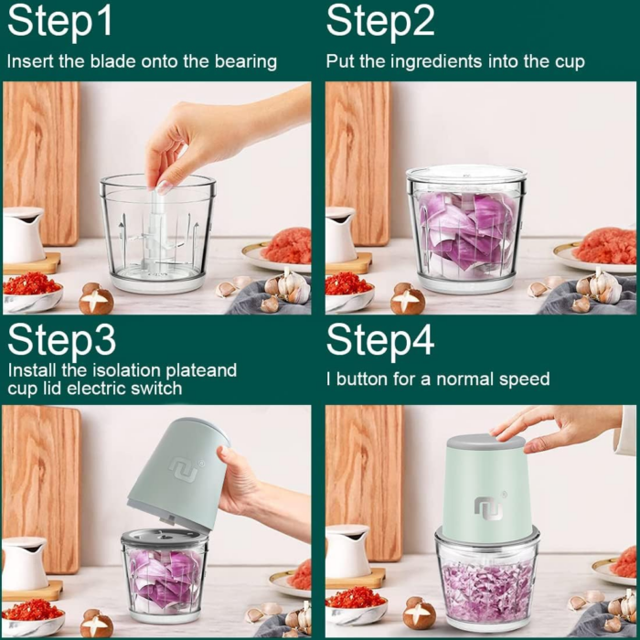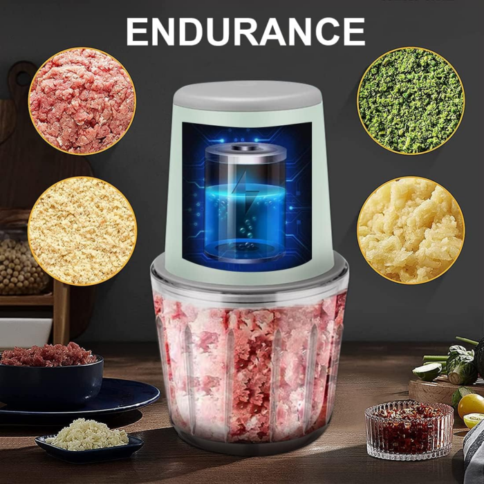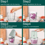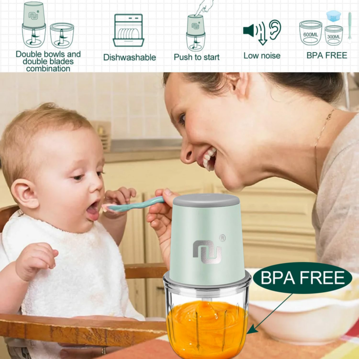The Portable Rechargeable Baby Food Processor with Glass Containers and Spoon is a compact and lightweight electric chopper that is perfect for quick small jobs in the kitchen. It is equipped with a powerful 150-watt motor and 3 reinforced blades that provide reliable performance. This mini food chopper can be used to chop garlic, ginger, meat, carrots, hemp hearts, onions, fruits, and more. It can also be used to make puree.