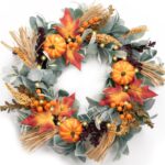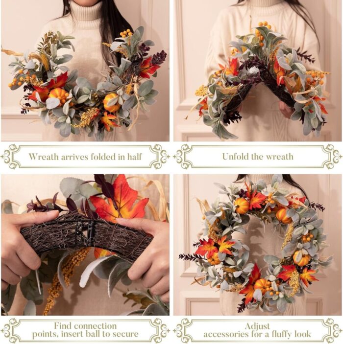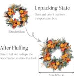 - Elevate your autumn decor with the Stunning 24” Collapsible Fall Wreath by Valery Madelyn, a distinguished brand known for its original fall decorations. This exquisite wreath is adorned with a captivating blend of silk lambs ear, grain wheat, vibrant maple leaves, and corn leaves, encapsulating the essence of the fall season. The addition of vivid orange berries and pumpkins enhances its rich color palette, making it an ideal choice for both indoor and outdoor settings. Whether you place it on your front door or use it as a centerpiece, this wreath will infuse your space with warm, seasonal charm, perfect for Halloween and Thanksgiving celebrations.