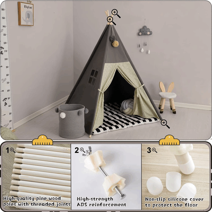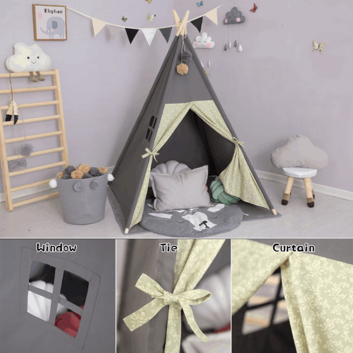 Transform your child's playtime with the TreeBud Stylish Stripe Teepee Tent, a beautifully designed playhouse that ignites imagination and creativity. This enchanting teepee, made from durable gray cotton canvas, provides a cozy retreat where children can immerse themselves in their own world of adventure. Whether it's for a birthday, holiday celebration, or just a special surprise, this teepee tent is sure to delight your little ones.