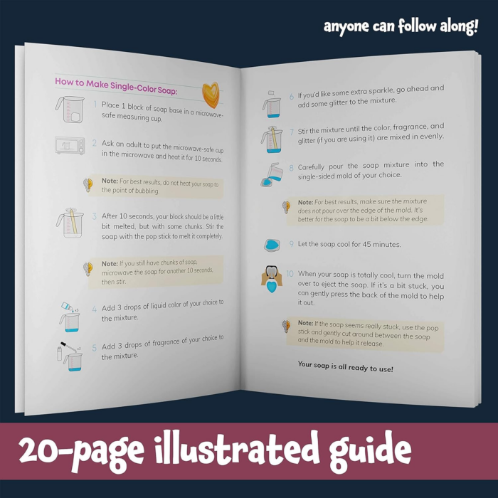 – Create 10 Soaps: The kit includes wax, coloring, fragrance, and glitter that can be mixed and poured into lovely molds to create beautiful and unique soaps. Kids can mix and match colors to create multi-colored layered soaps.