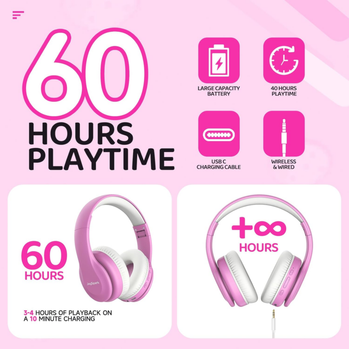 - 【Hours of Uninterrupted Listening】- With an impressive 60 hours of playtime on a single charge, the JoySpark kids headphones are perfect for extended listening sessions, whether it’s music, movies, or calls. Additionally, the 3.5mm backup jack ensures uninterrupted enjoyment, providing flexibility for various listening scenarios.